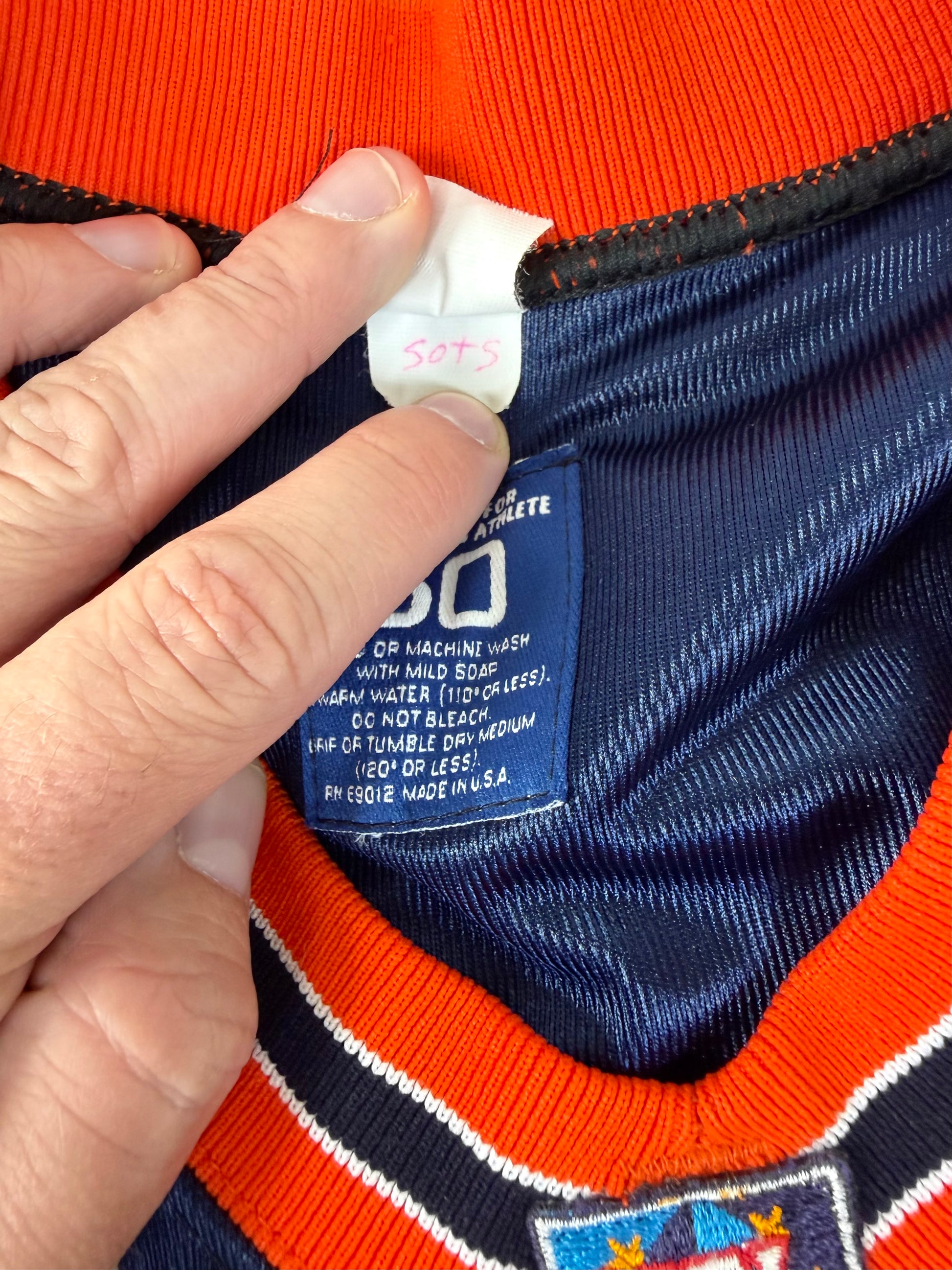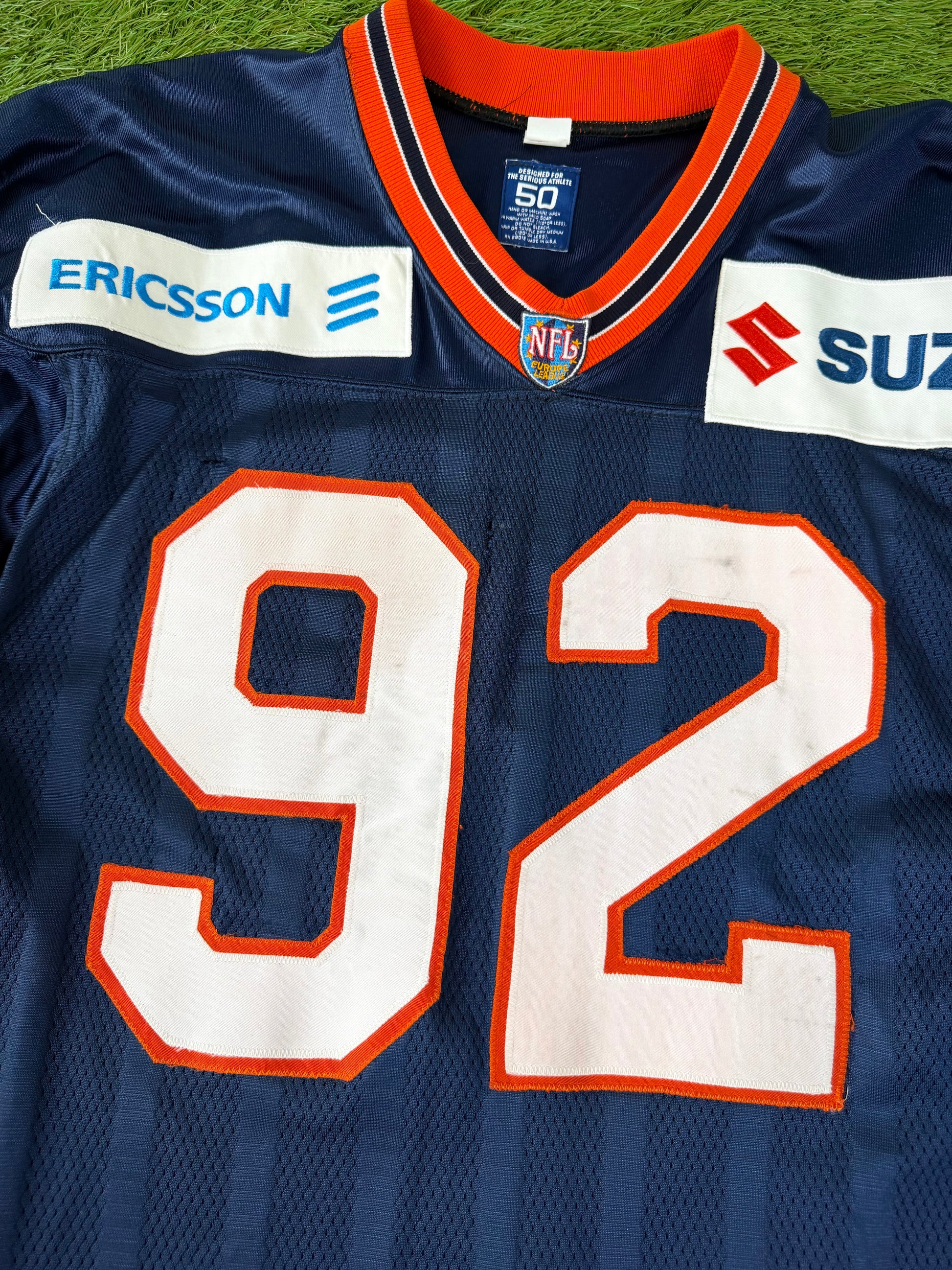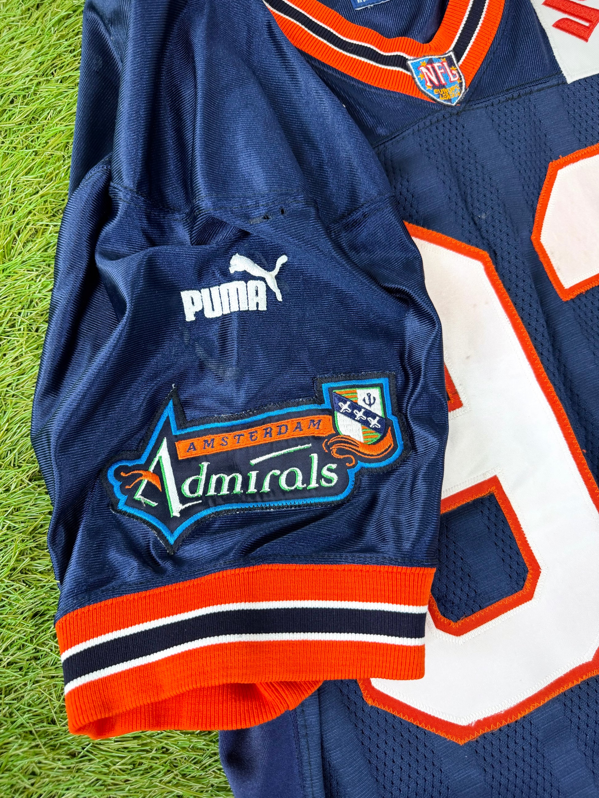 This Amsterdam Admirals jersey was worn during the 1999 NFL Europe season. Authentic NFL Europe gamers are getting harder to track down, and Admirals pieces are especially scarce. The Admirals featured some of the most notable NFL Europe Alumni including Kurt Warner, Adam Vinatieri, and Jake Delhomme. This one shows honest use and comes from a short-lived era of NFL history that collectors love. If you’re looking for an NFL Europe gamer for your collection, this is a strong example from a tough team to source!