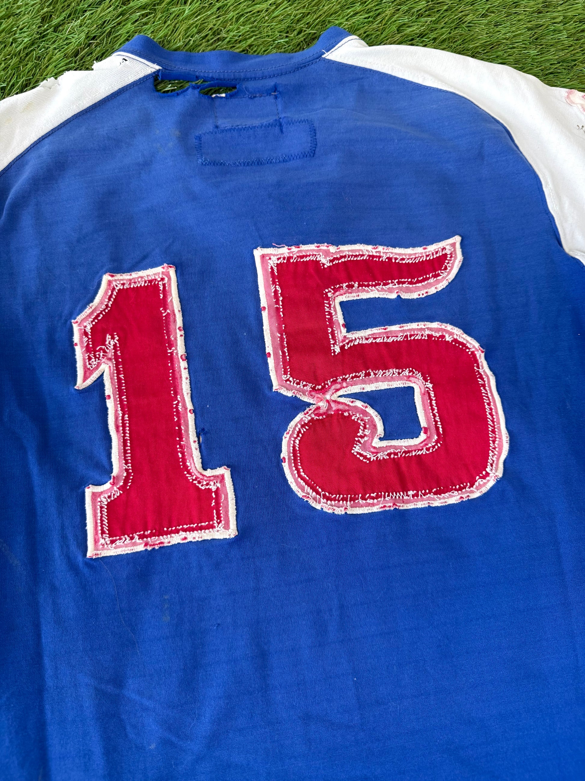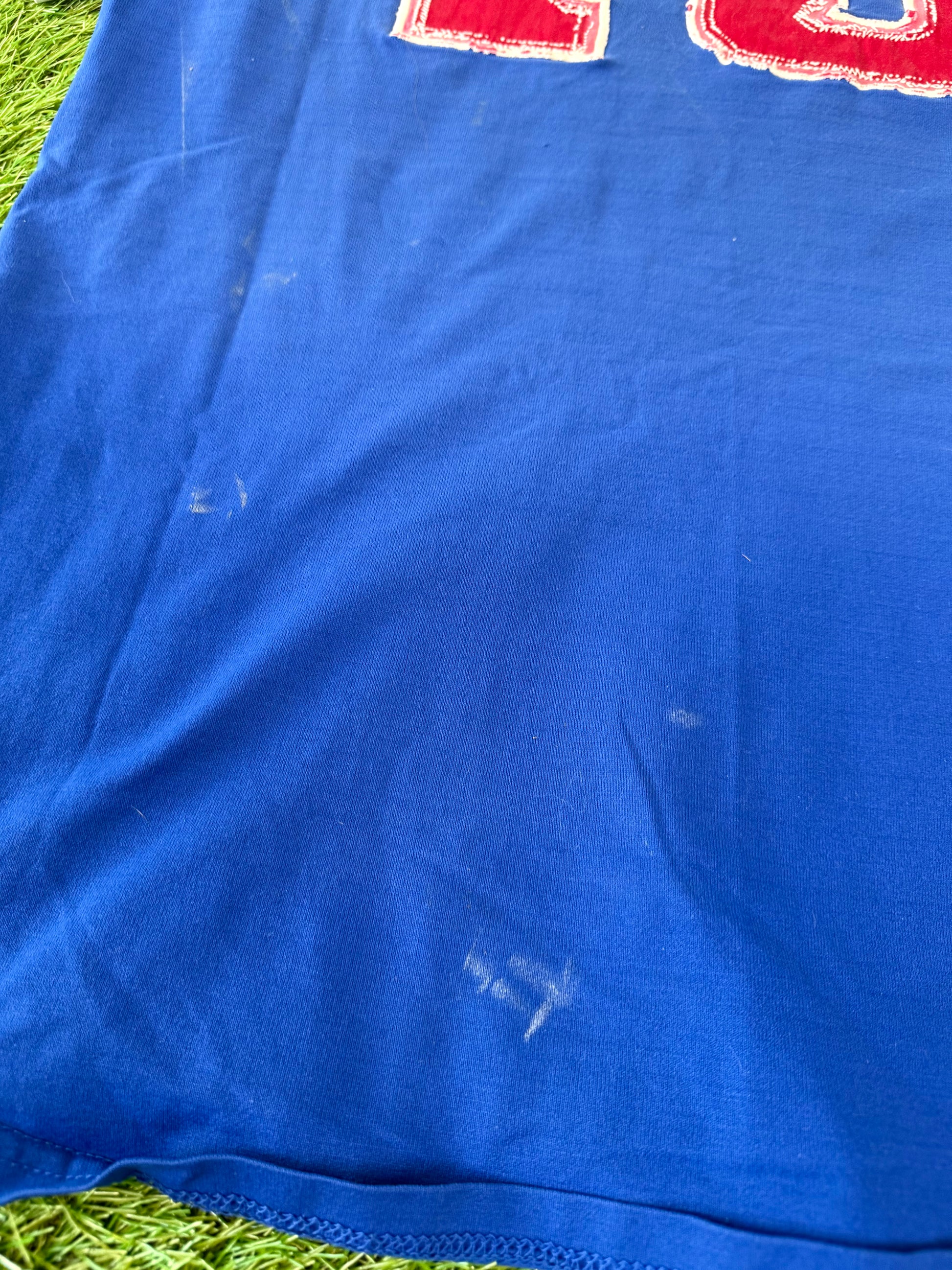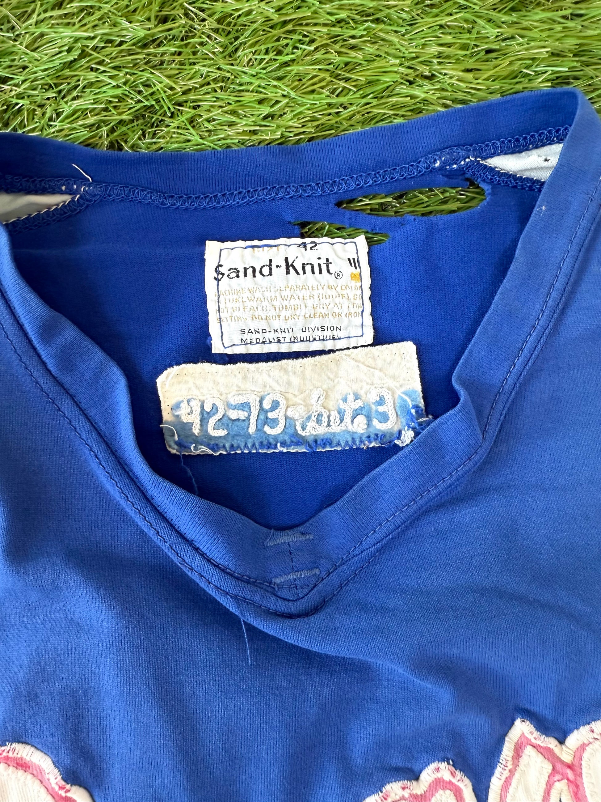 Condition: 5/10. Jersey is pretty beat up with several holes and blemishes. Most notably, the top white layer of the back numbers has been removed. This was likely worn and washed dozens in not hundreds of times, so it’s no surprise it’s seen better days!
