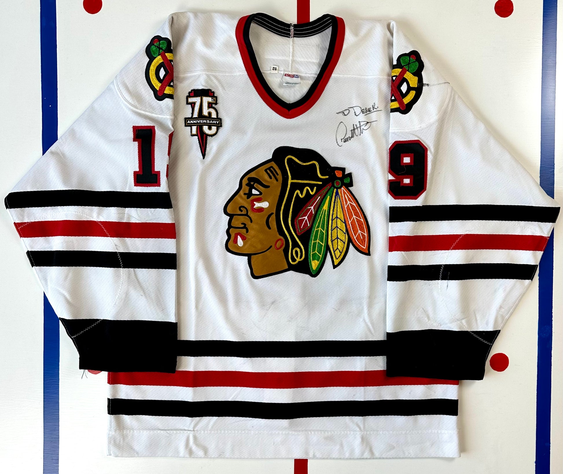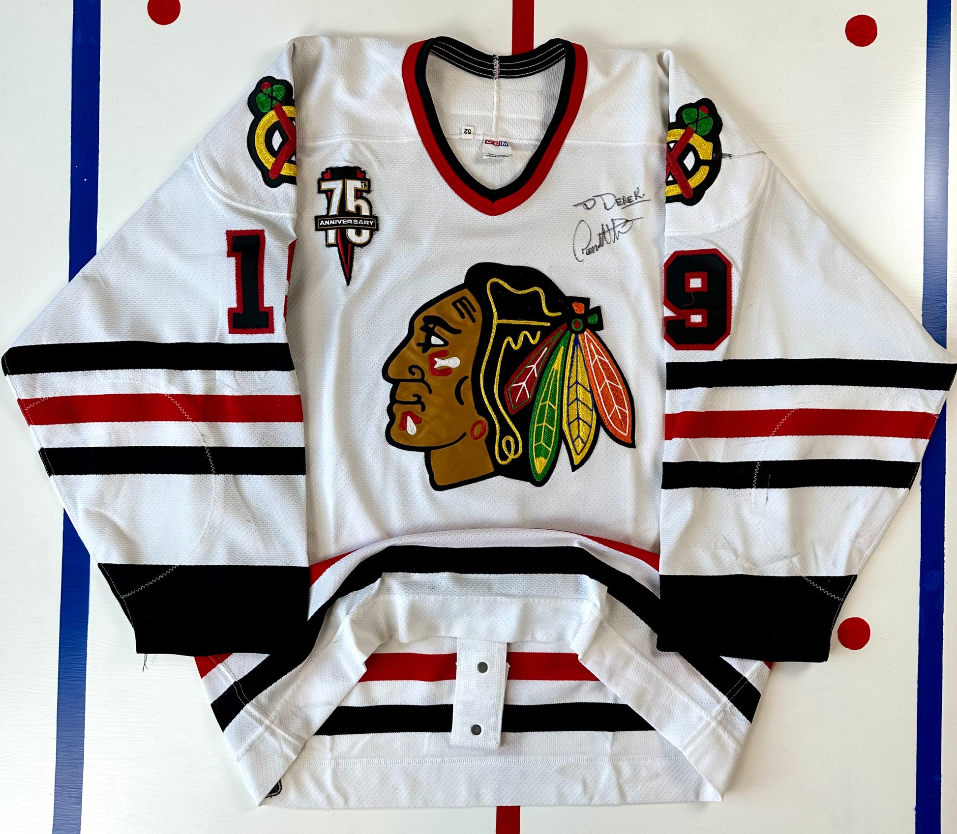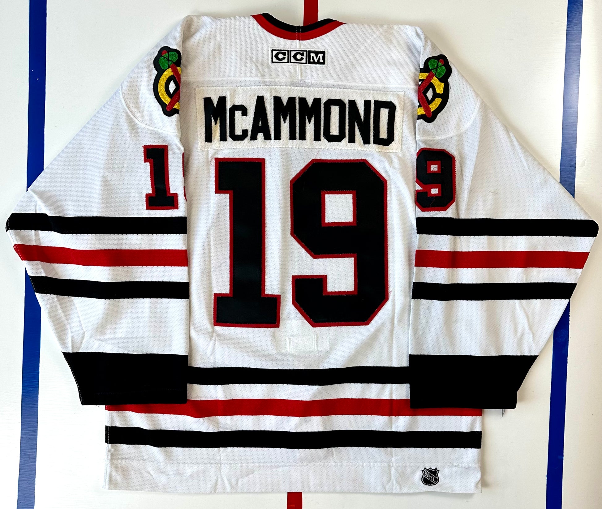 Condition: Hammered with puck marks, team repairs, scuffs, board burns, etc. Home game footage is tough to find from this era of Blackhawks hockey, but this jersey would be very easy to photo-match with all of these obvious identifiers. Autographed my Mcammond and made out to “Derek”.