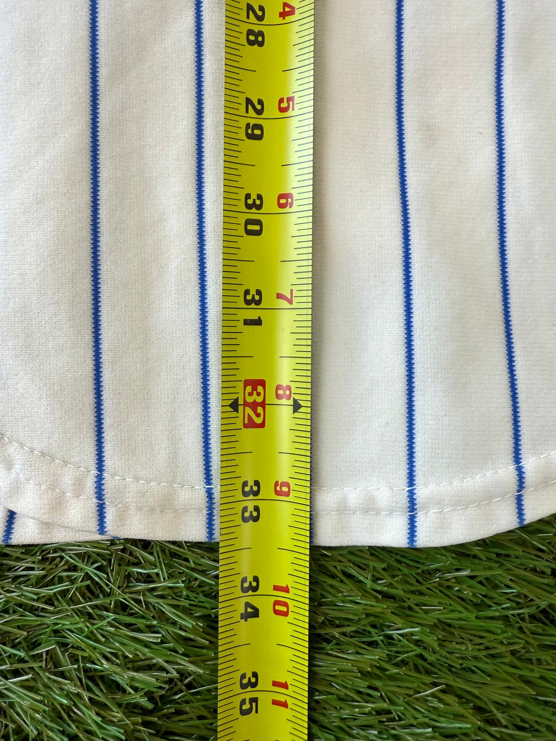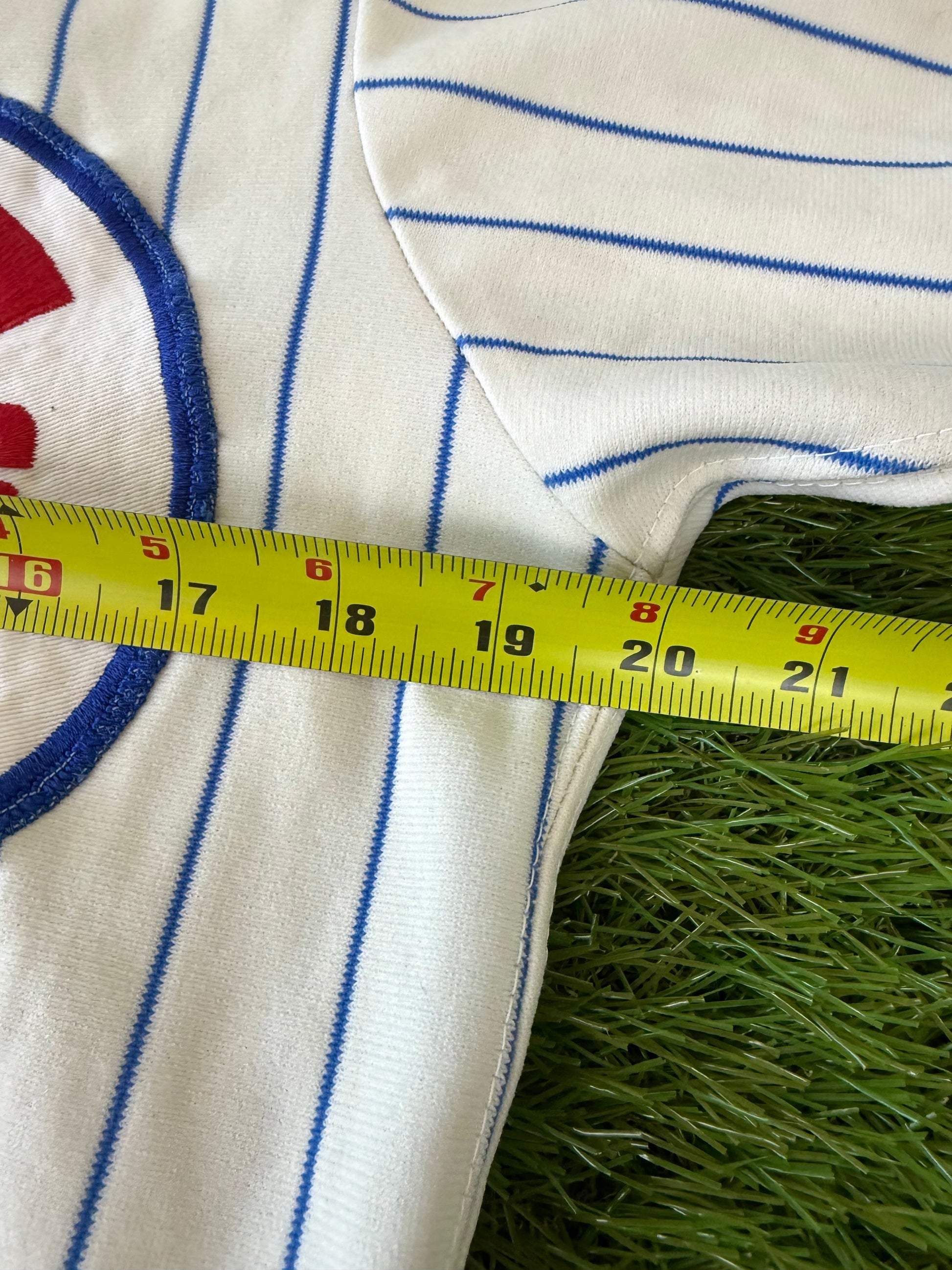 The iconic Cubs home pinstripe jerseys have undergone very few changes over the years, but this one features a skinnier circle on the front logo that was worn from 1957-1978 as well as the tan and blue Cub logo on the left sleeve that was worn from 1962 to 1978. This 1973 model jersey is the very first year of the pullover style that became super popular throughout the MLB in the 70s and 80s.