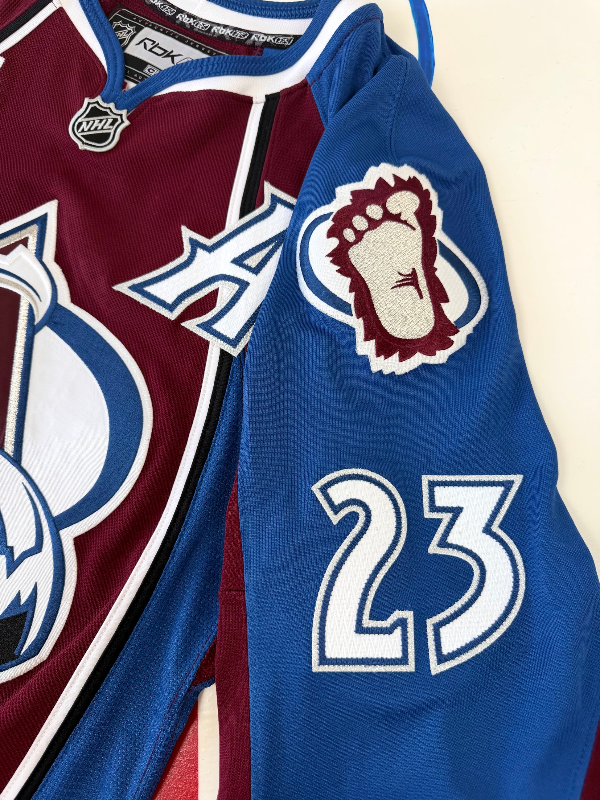On Opening Night of the 2009-2010 NHL season, the Colorado Avalanche honored Joe Sakic by raising all time legend Joe Sakic’s No. 19 to the Pepsi Center rafters. As part of the celebration, Avs players wore this commemorative Captain’s C patch on their right chests. This one also includes Hejduk’s alternate captain “A”. Two seasons later, Hejduk would be named Colorado’s captain, and later have his number 23 retired by the Avs.