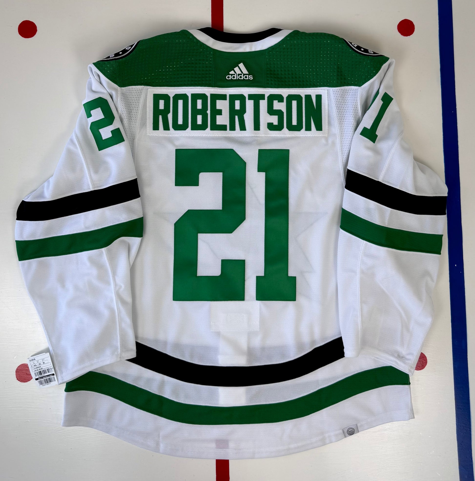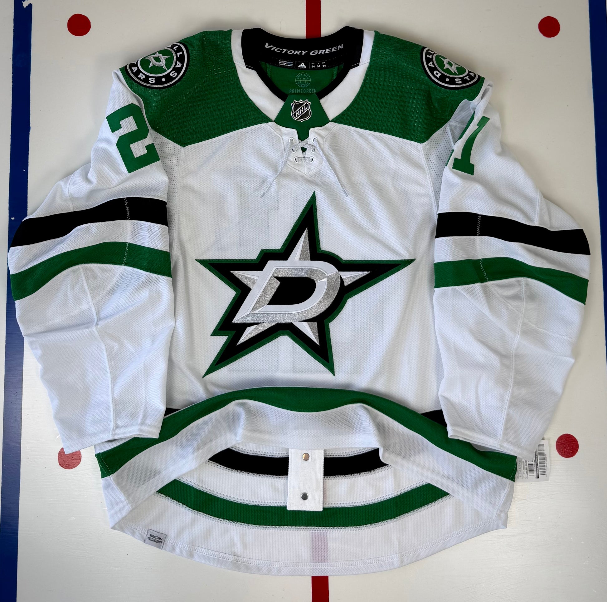 Since his 2021-22 breakout season, Jason Robertson has averaged 37.75 goals a season, leading Dallas to the playoffs in each of those seasons. This Primegreen on-ice authentic is in a difficult to find size 54, and is specific to the 2022-23 and 2023-24 seasons after the Stars switched from perforated to solid numbers.