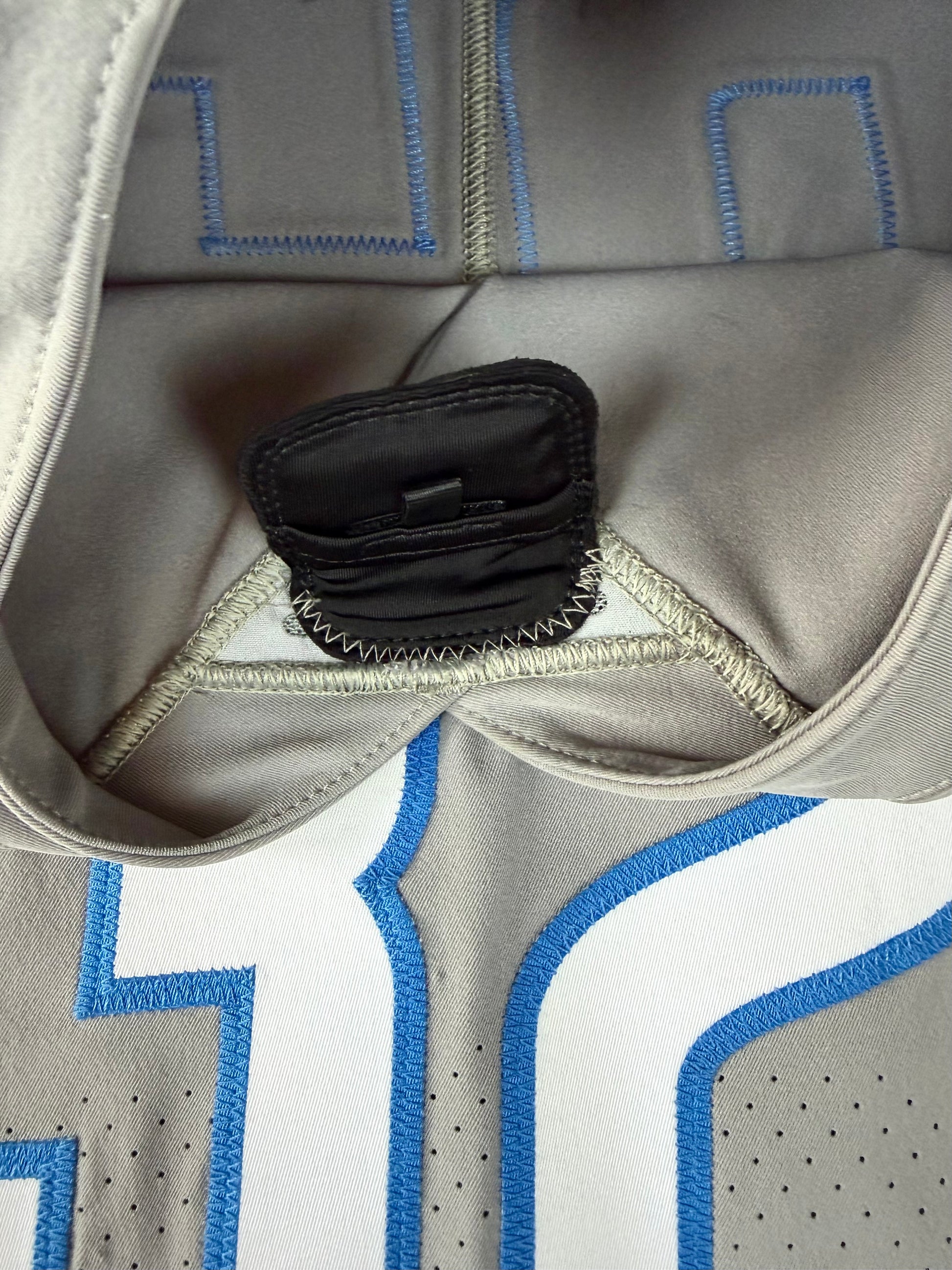This 2021 alternate jersey was made up for Lions RB D’Andre Swift. 2021 was a turning point for the Lions as Dan Campbell took the reins in his first year as head coach. It was also the first year of Jared Goff as the Lions QB. This pro cut jersey also includes a tracker pouch sewn into the collar.