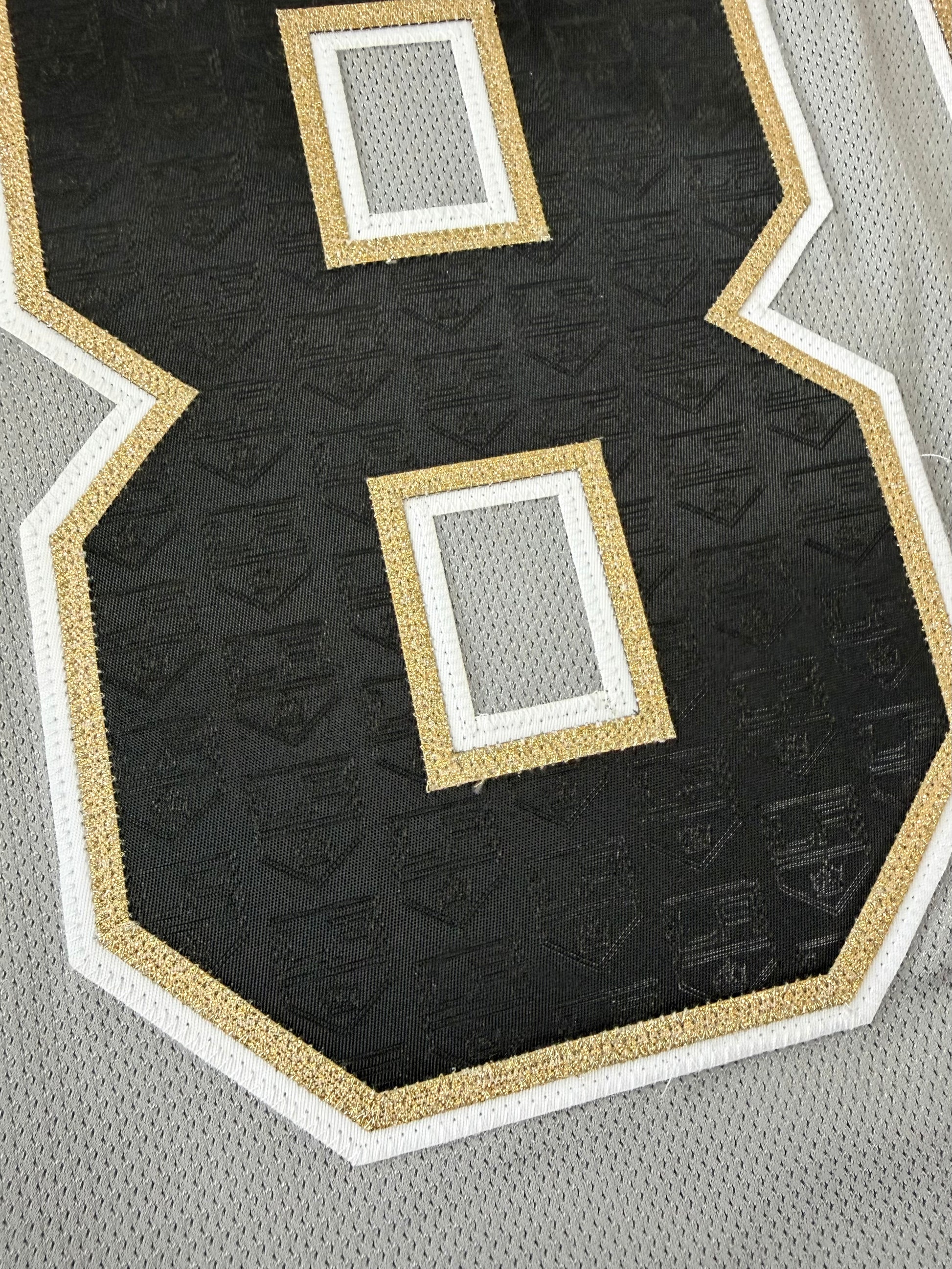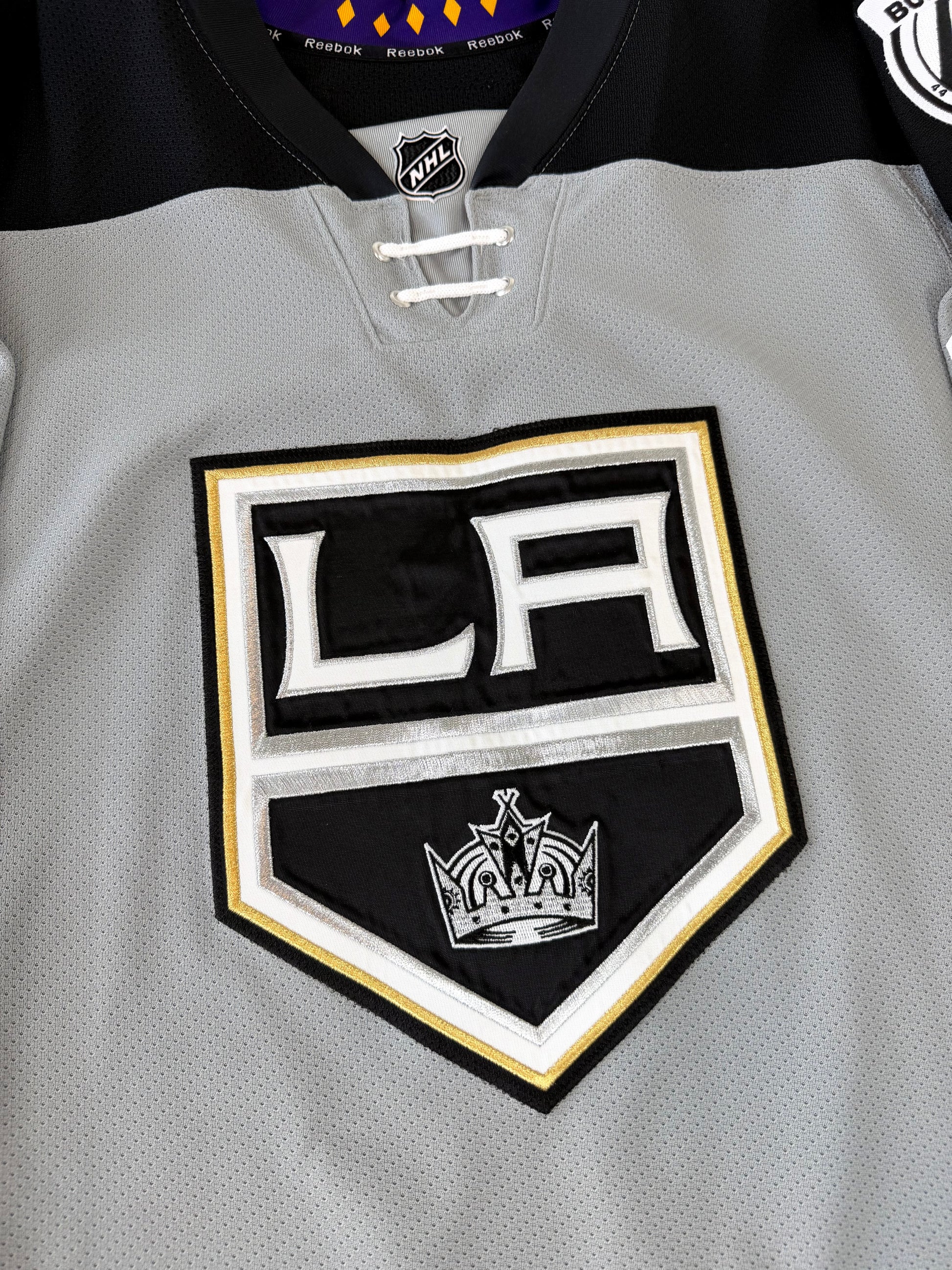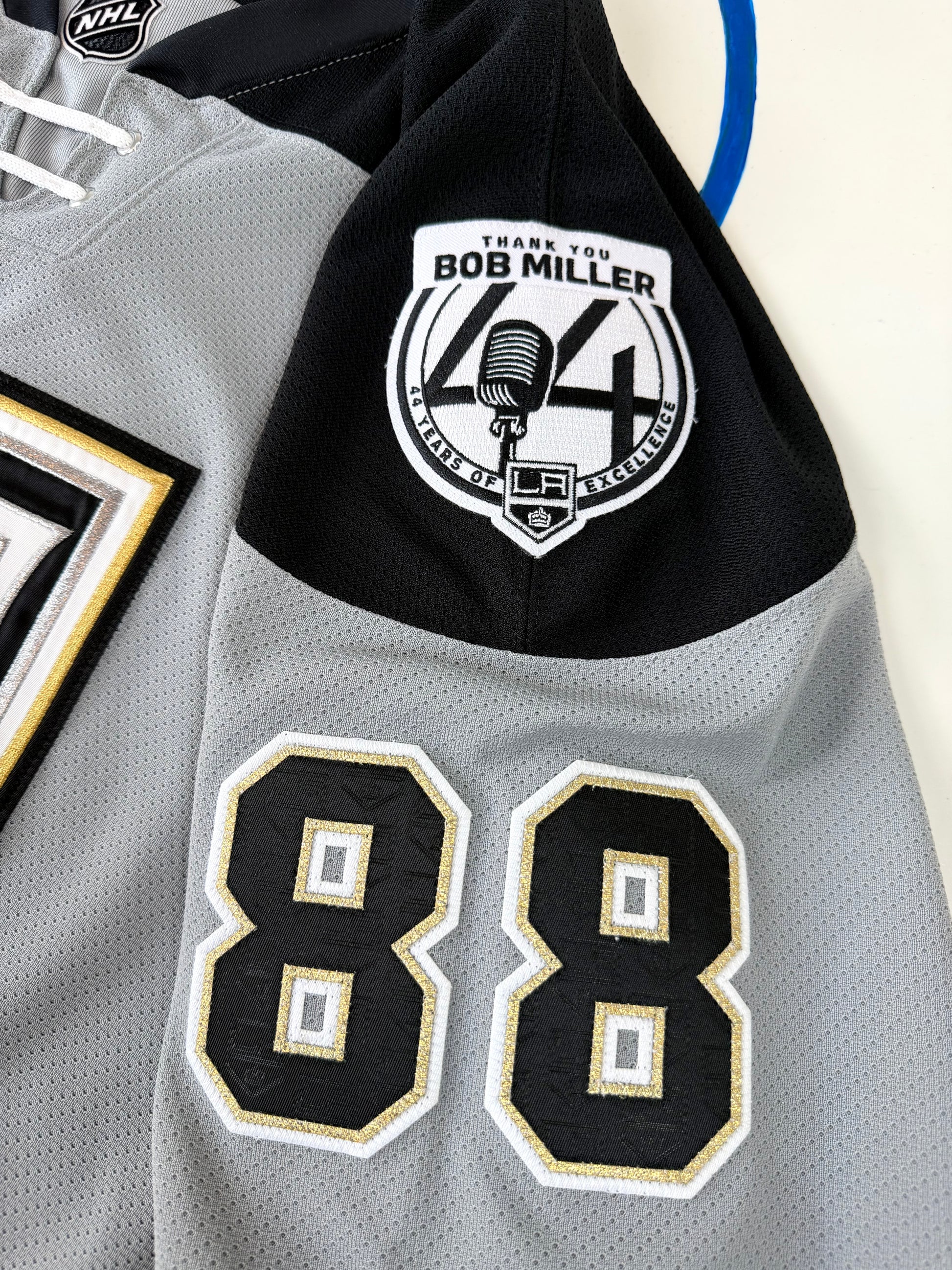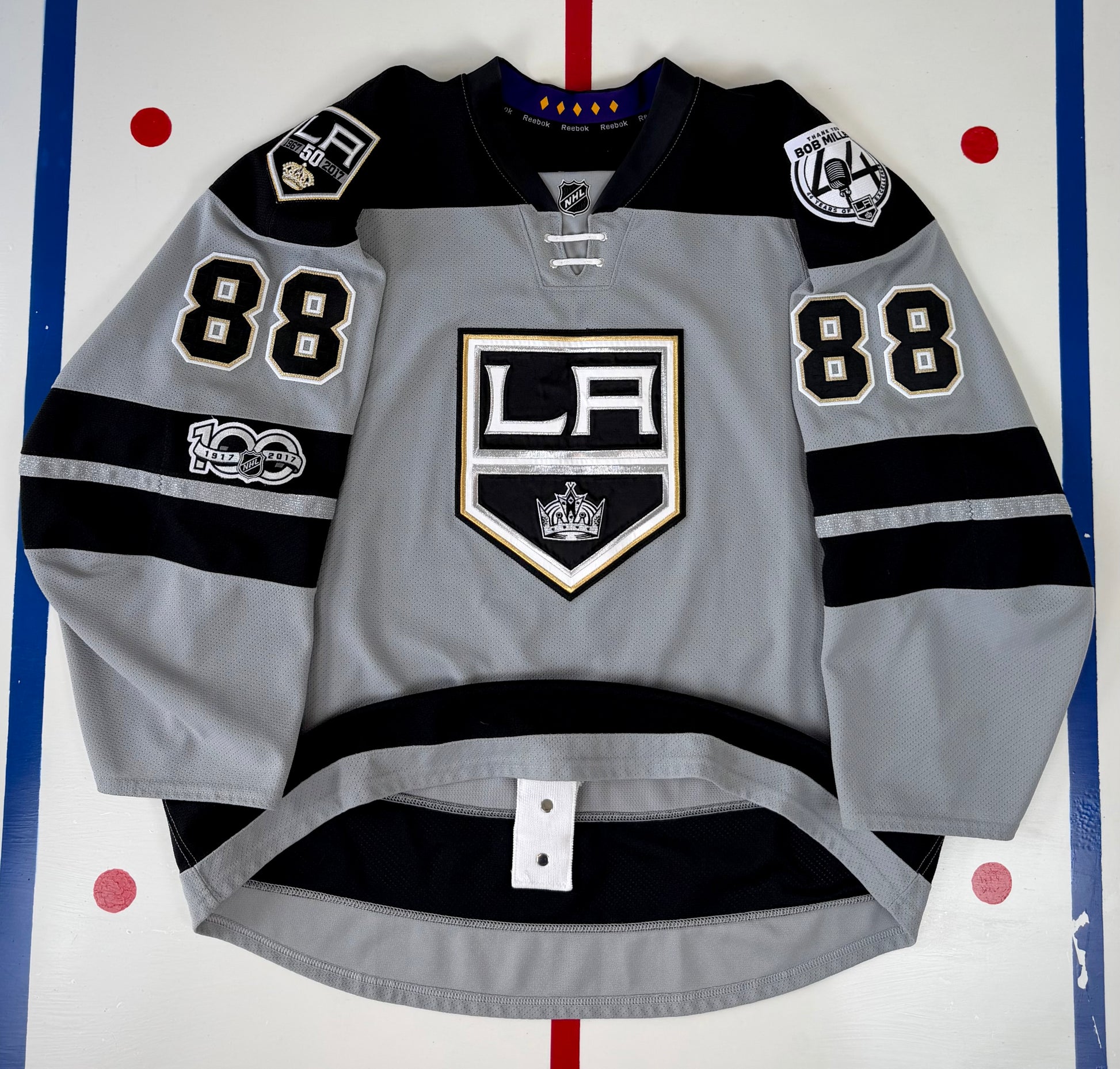 This rare team issued alternate jersey features three different patches including an NHL 100th Anniversary patch, an LA Kings 50th Anniversary patch, and Bob Miller farewell patch. But perhaps the most notable detail on this jersey is the special Kings etched twill name and numbers.