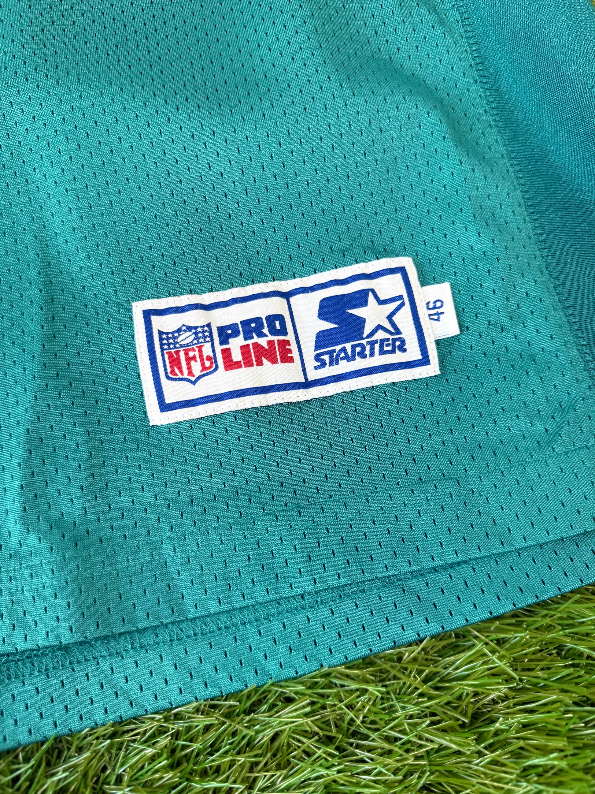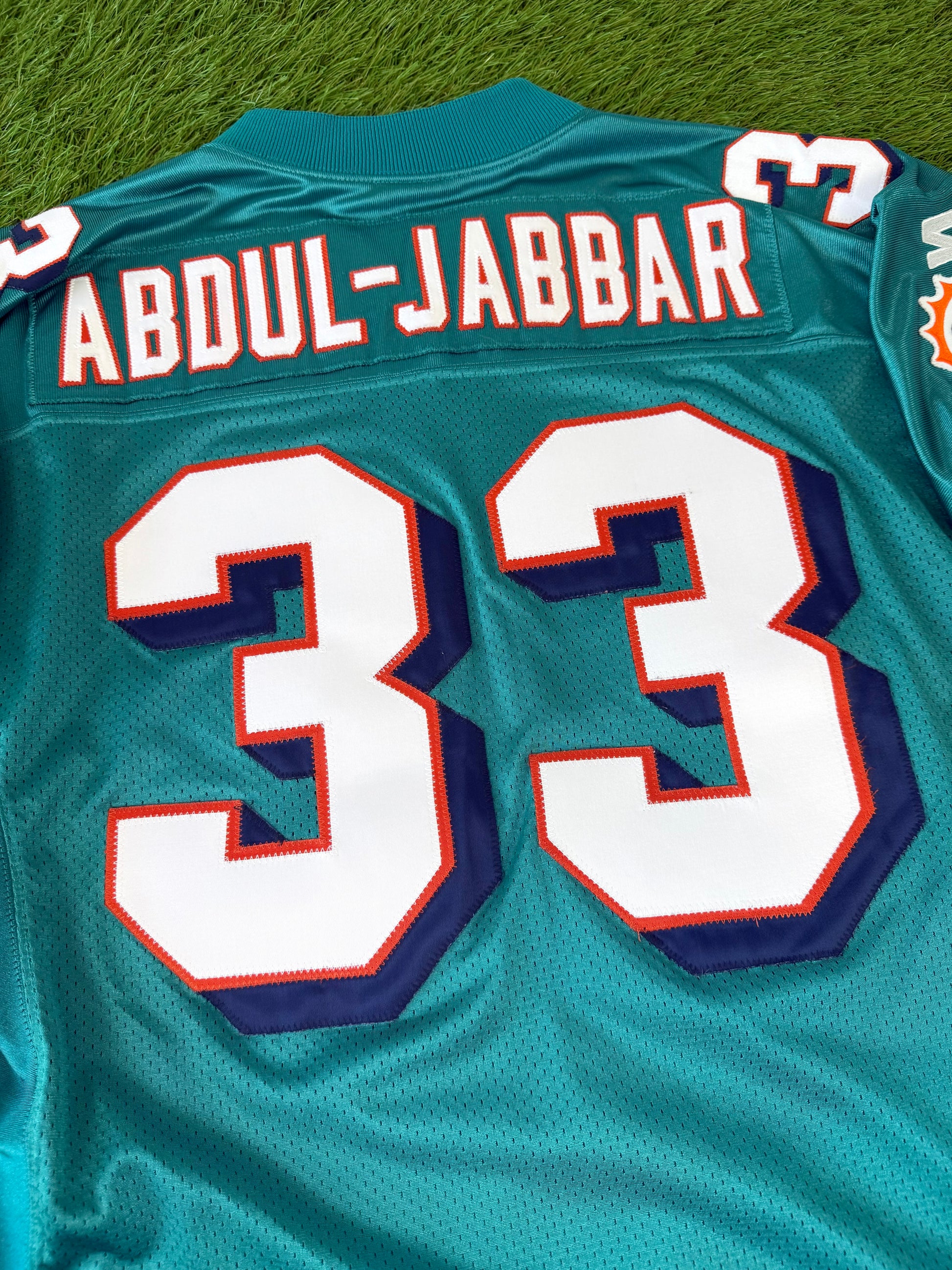 This late 90s authentic Karim Abdul-Jabbar Dolphins jersey throws it back to the tail end of the Dan Marino led Dolphins teams. Karim was a workhorse running back for Miami during that era, even leading the league in touchdowns in 1997.