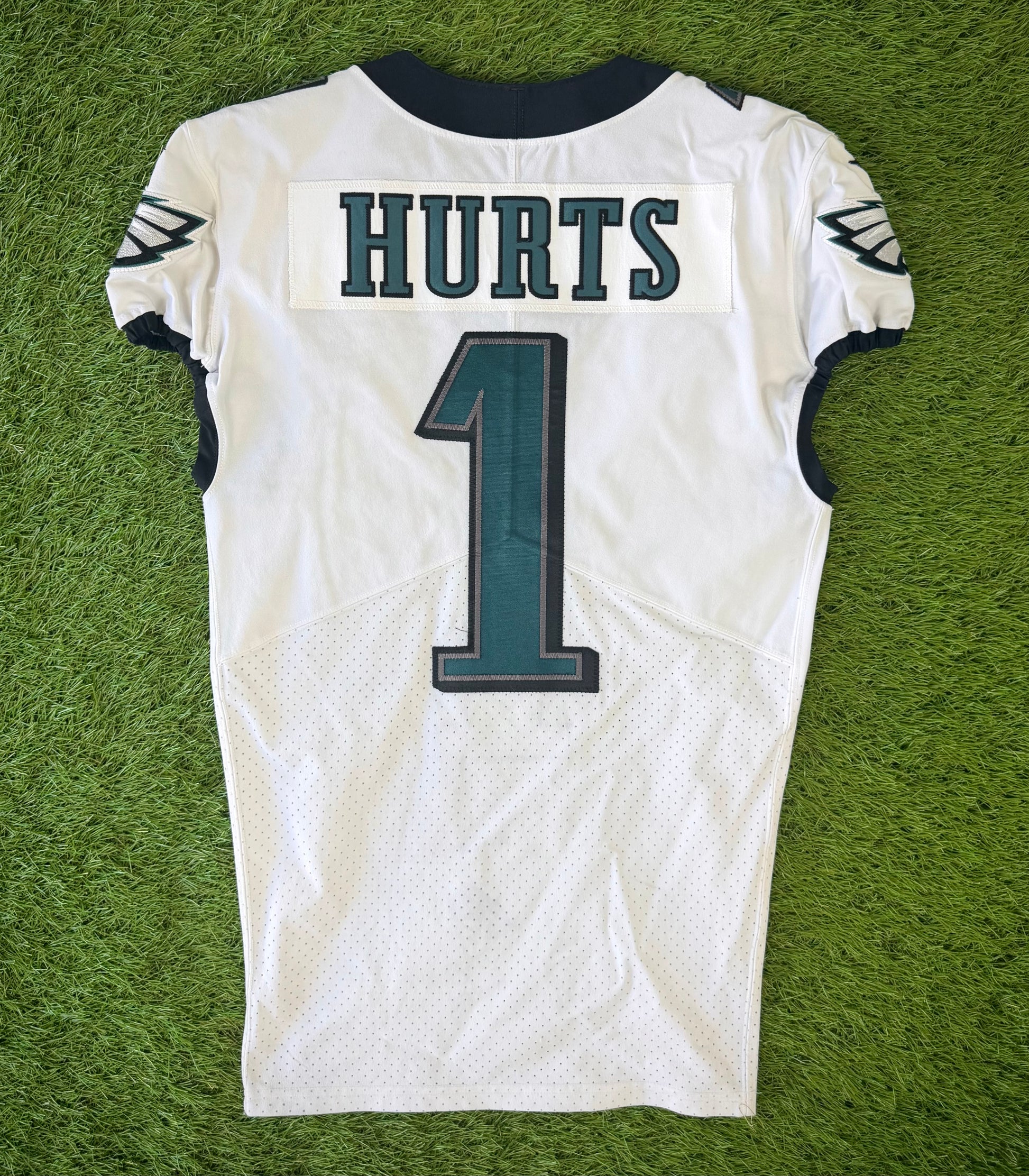 This was originally a 2019 game used jersey worn by #1 Cameron Johnston. The nameplate was swapped for Hurts and the 1-star captains patch was added to replicate the jersey that Jalen Hurts wore during the 2021 season.