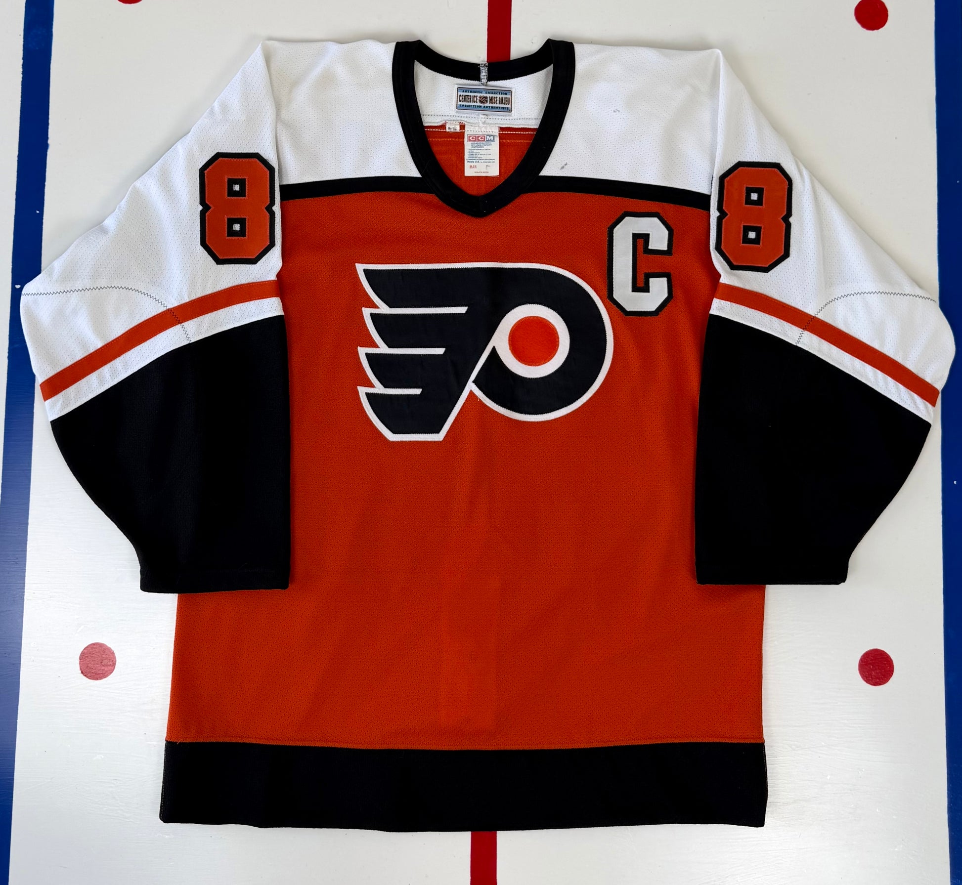 This vintage authentic jersey is signed by Flyers legend Eric Lindros. Lindros was named captain of the Flyers in 1994, and would wear the Captain’s C for the rest of his time in Philly.
