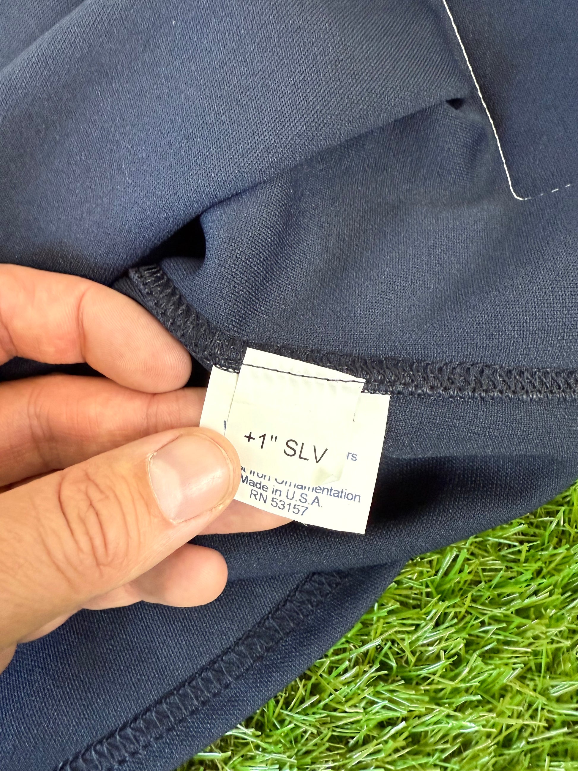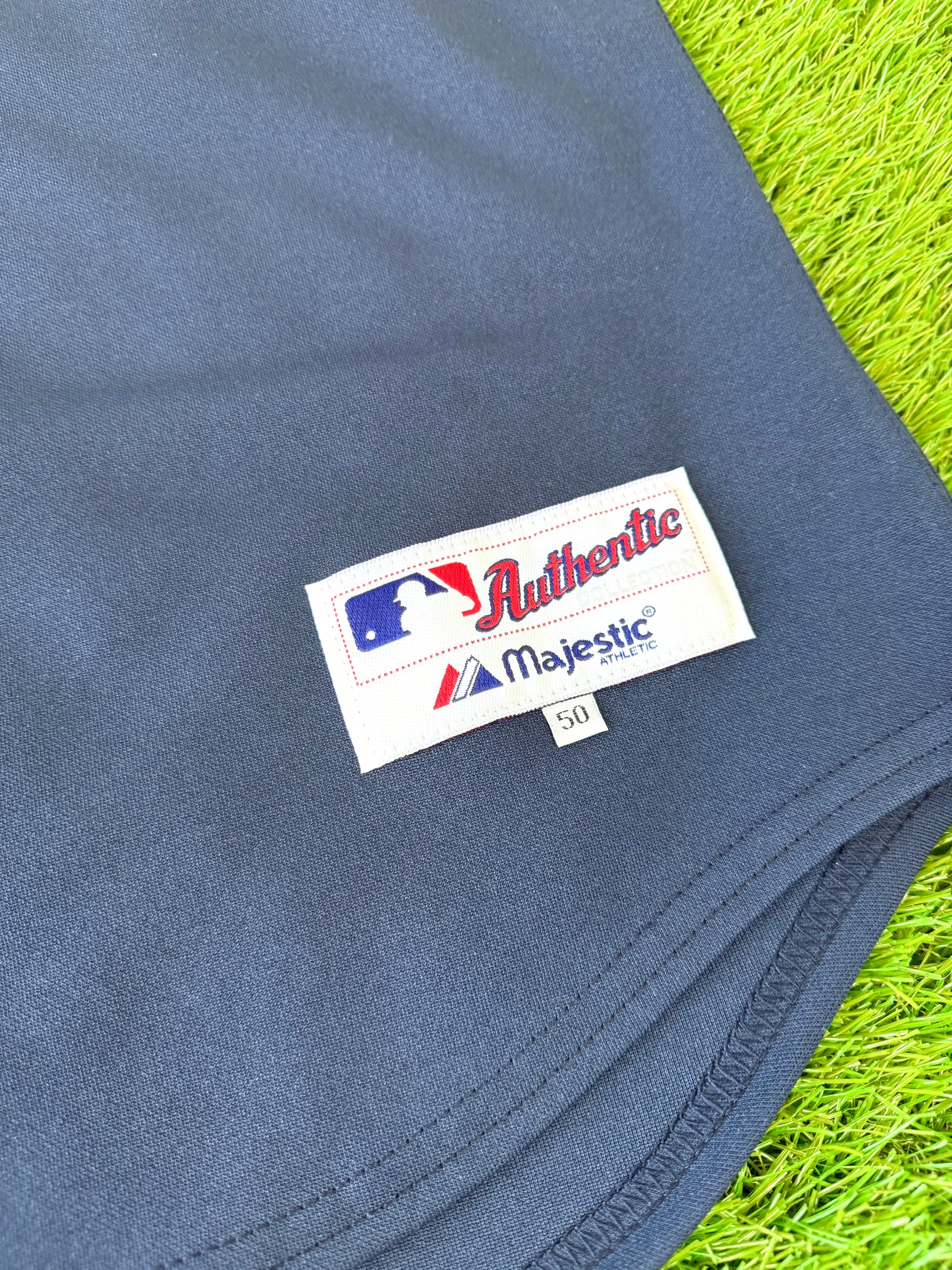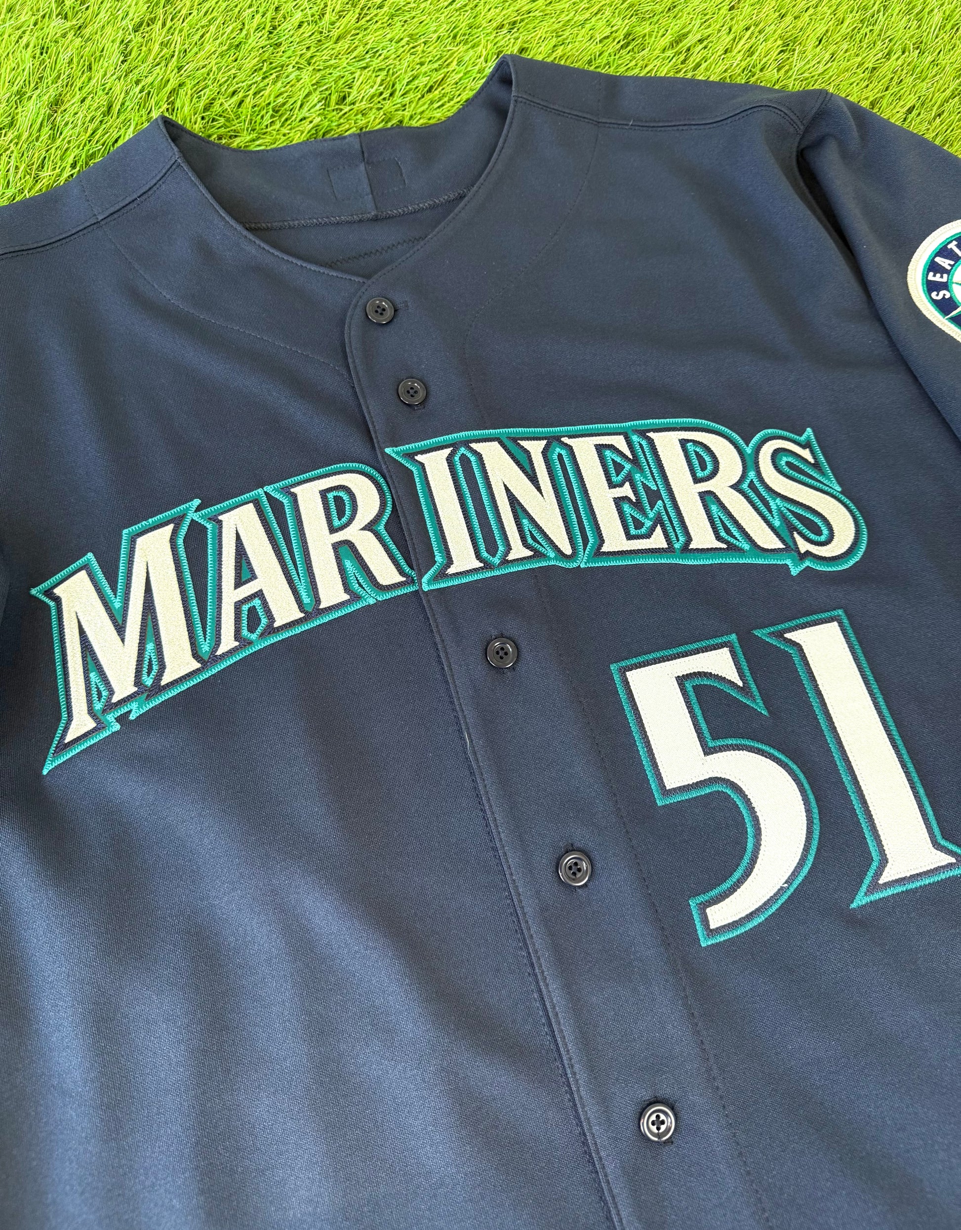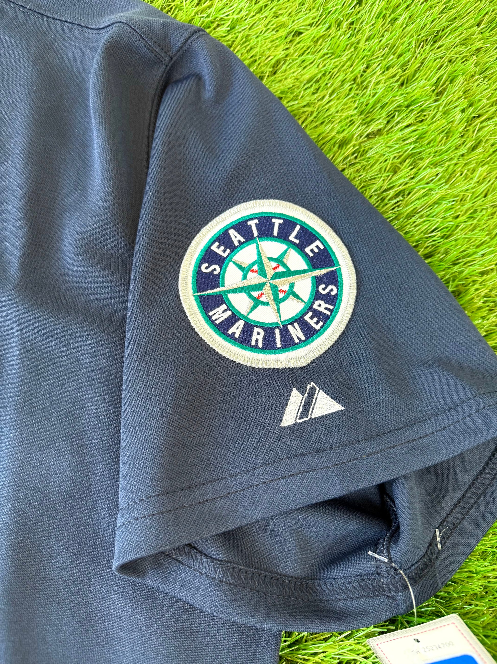 This navy blue alternate jersey style was worn by the Mariners from 2003-2011. Seattle began making these Navy Alternate jerseys in Cool Base fabric starting in 2008, so anything prior to that was exclusively made in this double knit material. From 2003-2004 Mariners jerseys were made by Russell Athletic before Majestic took over jersey manufacturing league wide in 2005. Finally, nameplates were dropped from Seattles jerseys in 2007, making this particular jersey specific to 2005 and 2006.