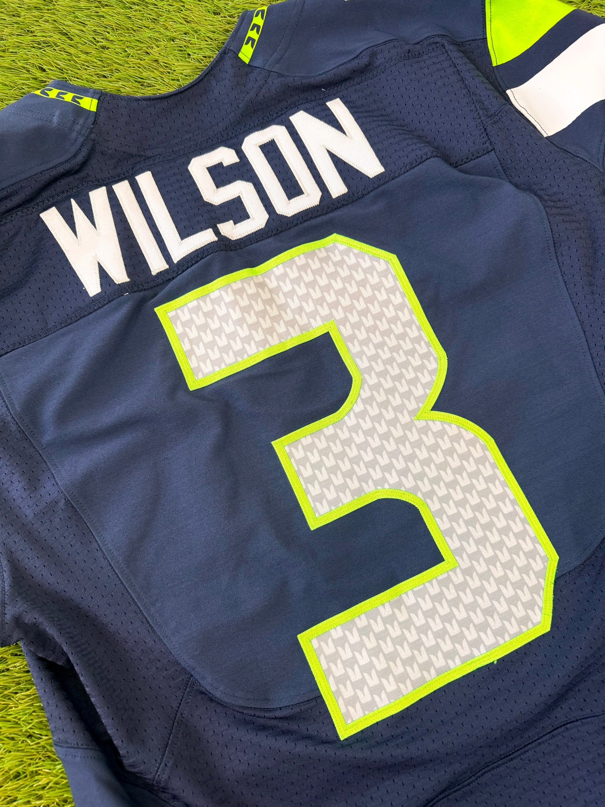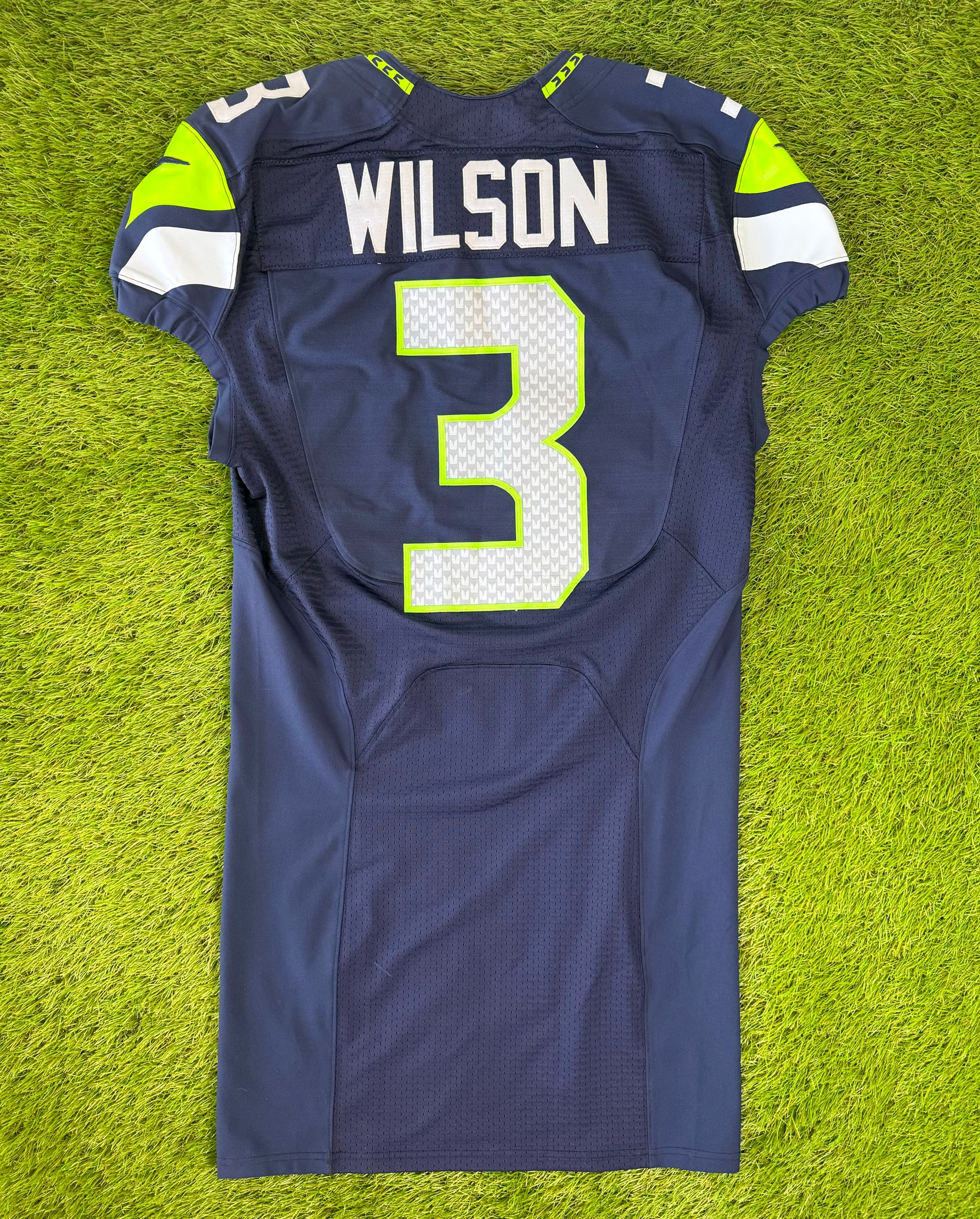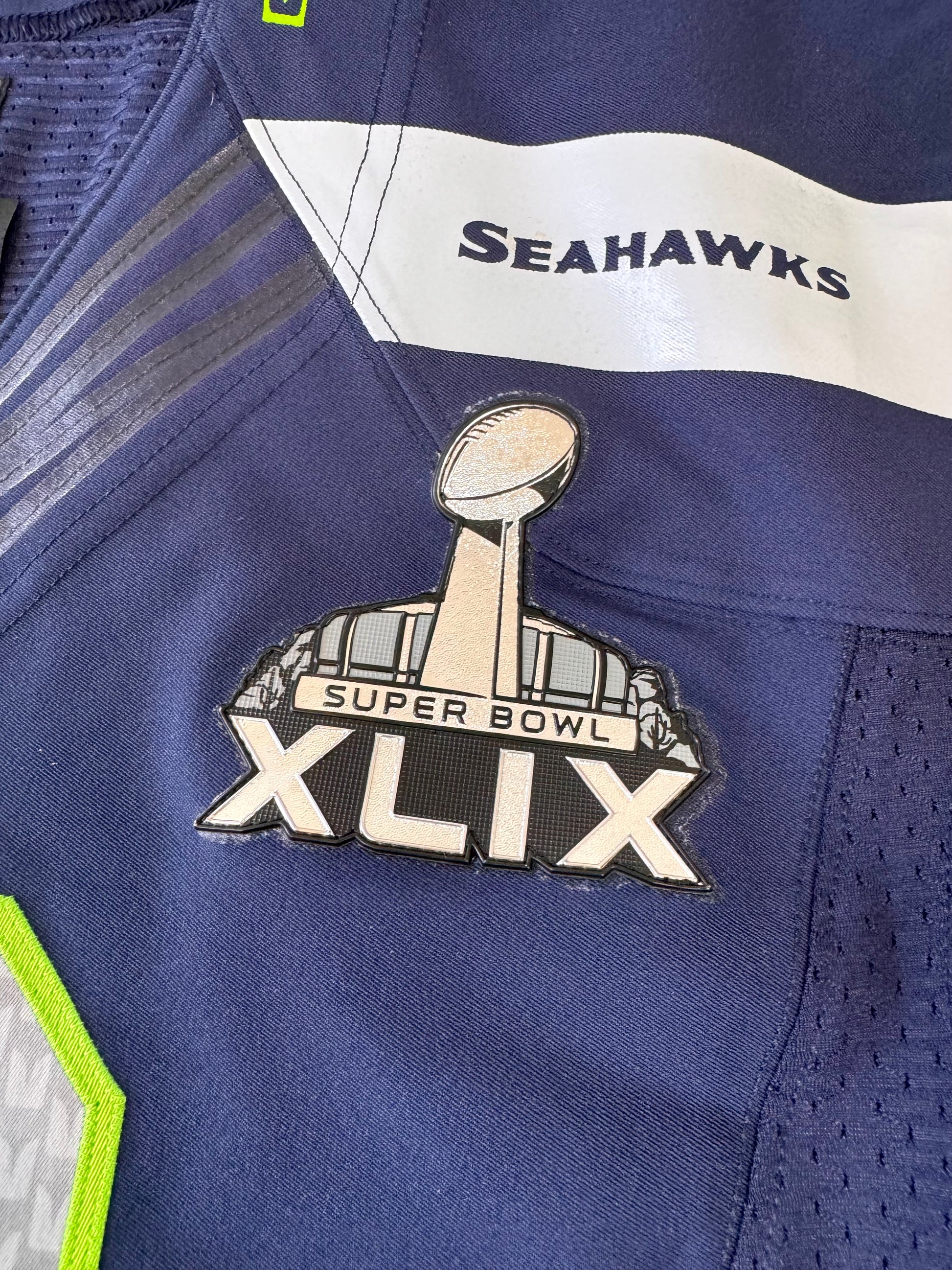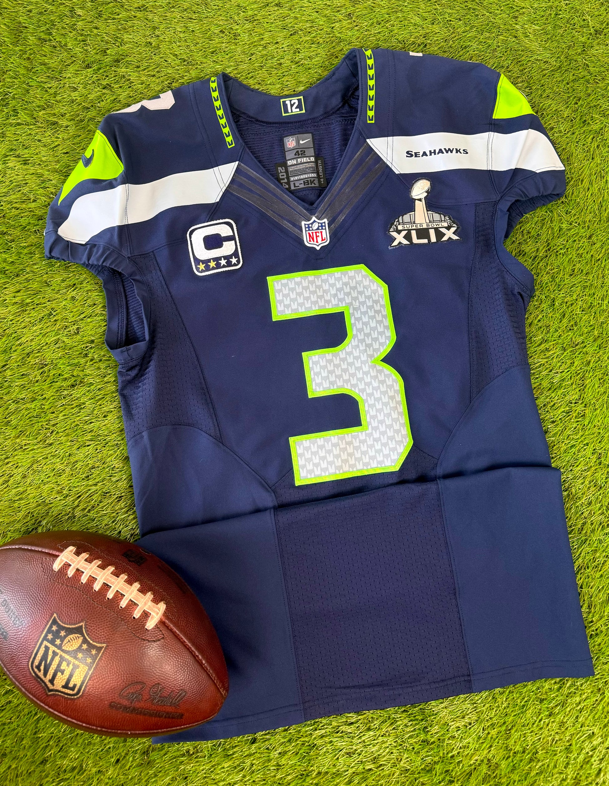 This team issued Nike Elite Russell Wilson jersey was acquired directly from the Seattle Seahawks with Super Bowl patch removed. A high quality chrome flex style reproduction Super Bowl patch has been professionally stitched over the residue of the original patch by the Seahawks customizer and also features a Seahawks Navy 2 star captains patch. Name/numbers are all original.