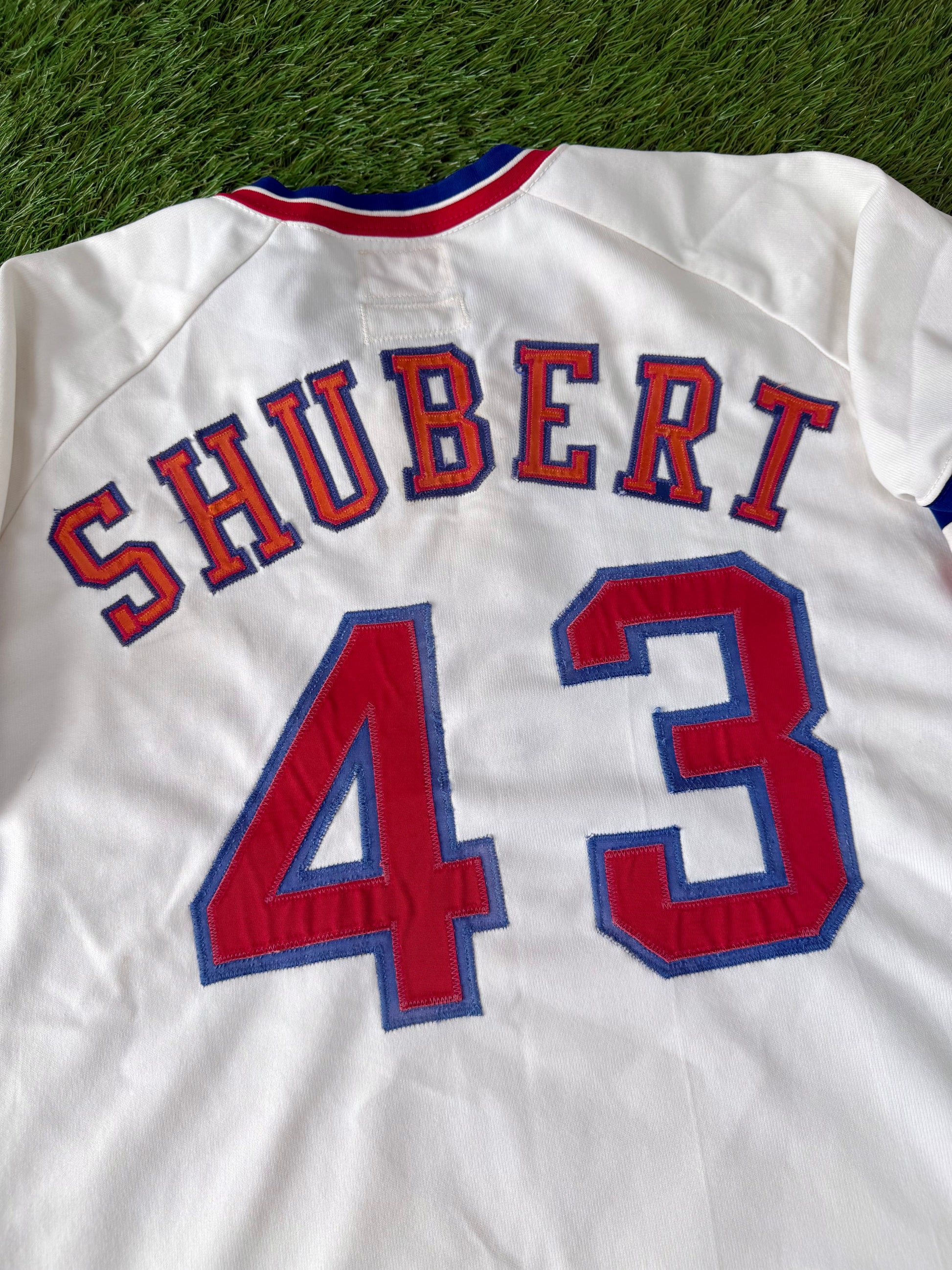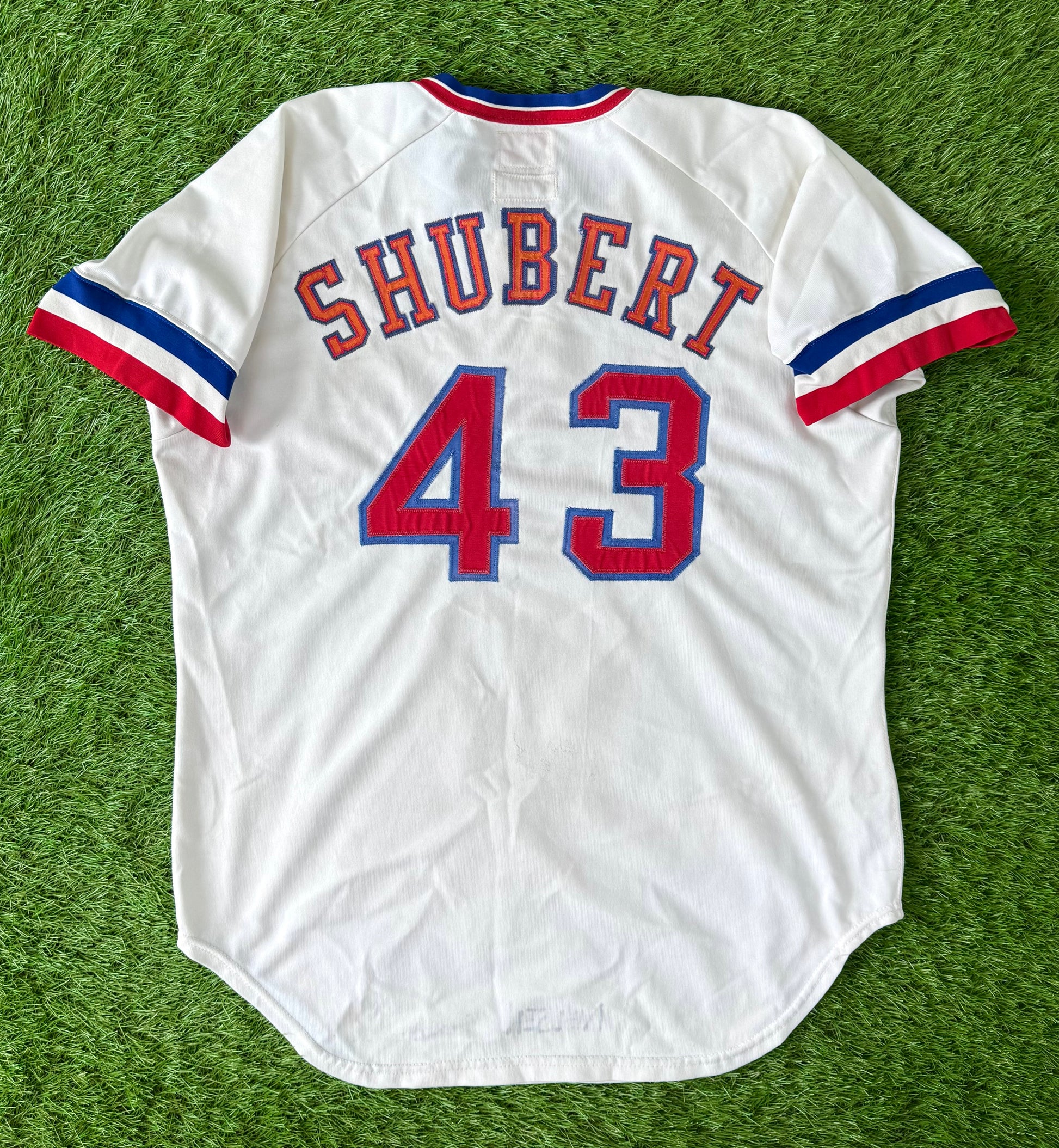 Rich Shubert was a pitcher drafted by the Rangers in 1973 and bounced around the Rangers farm system through the 1976 season. He never played a regular season MLB game so this was likely worn for spring training.