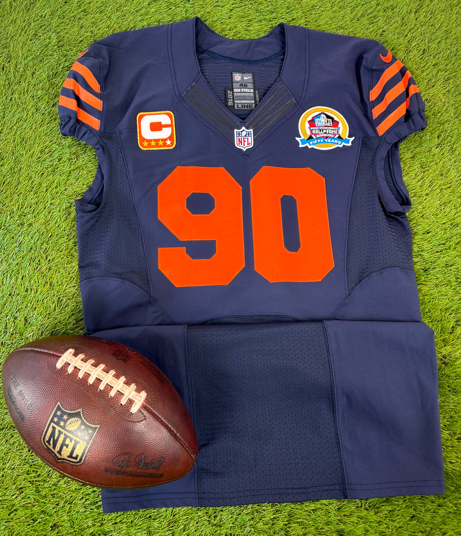 This Bears team issued jersey throws it back to the 1940's and the days of Bronco Nagurski, Sid Luckman, and legendary coach George Halas. Professionally customized to Hall of Famer Julius Peppers with Hall of Fame 50th Anniversary patch as the Bears wore during their 2012 Week 15 matchup vs Green Bay.