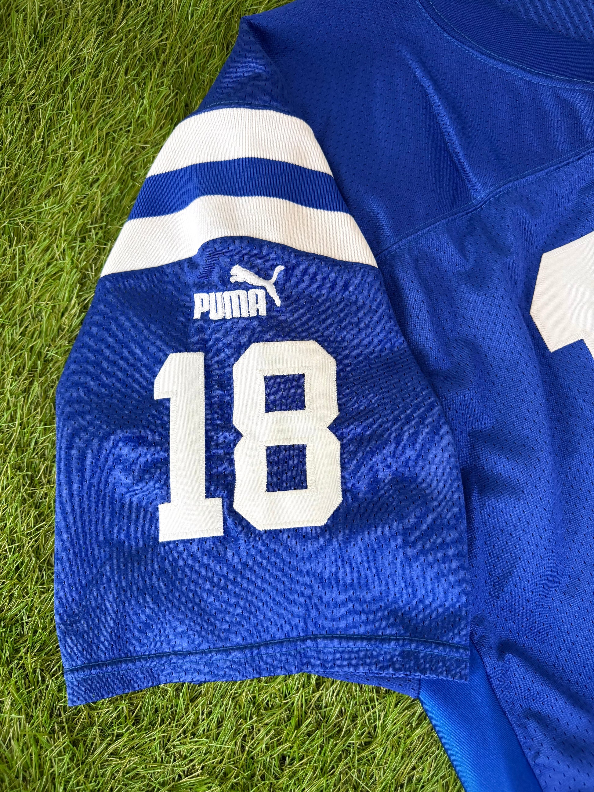 After Manning’s infamous rookie campaign in 1998 in which the Colts went 3-13 and Peyton couldn’t decipher which team to throw the ball to, the Colts completely turned things around in 1999, as “The Sheriff” led the colts to a 13-3 record, donning these Puma branded jerseys for the first time, and offered a glimpse into what was to come in Peyton’s legendary career. These only lasted 2 seasons until Reebok took over jersey manufacturing league wide in 2001.