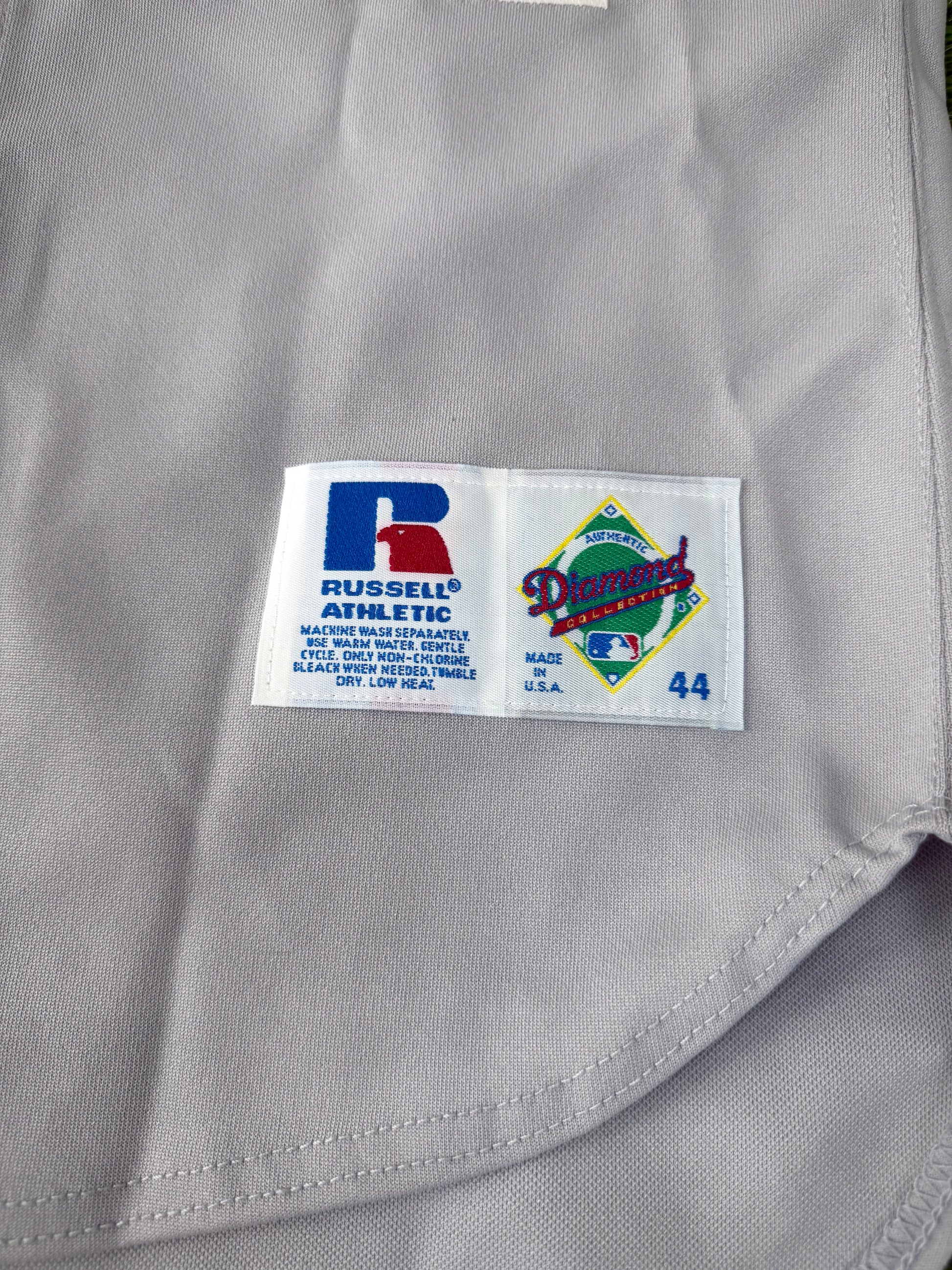 This 90s authentic throws it back to the first year of this now iconic road gray Cubs jersey with then brand new walking cub sleeve logo. The “CHICAGO” word mark underwent a slight change in 1999, making this a two year style only. The right sleeve of this jersey features Jackie Robinson color barrier 50th anniversary patch that was worn by teams during the 1997 MLB season, the height of the steroid era, and the year before Sammy’s legendary 66 homer season.